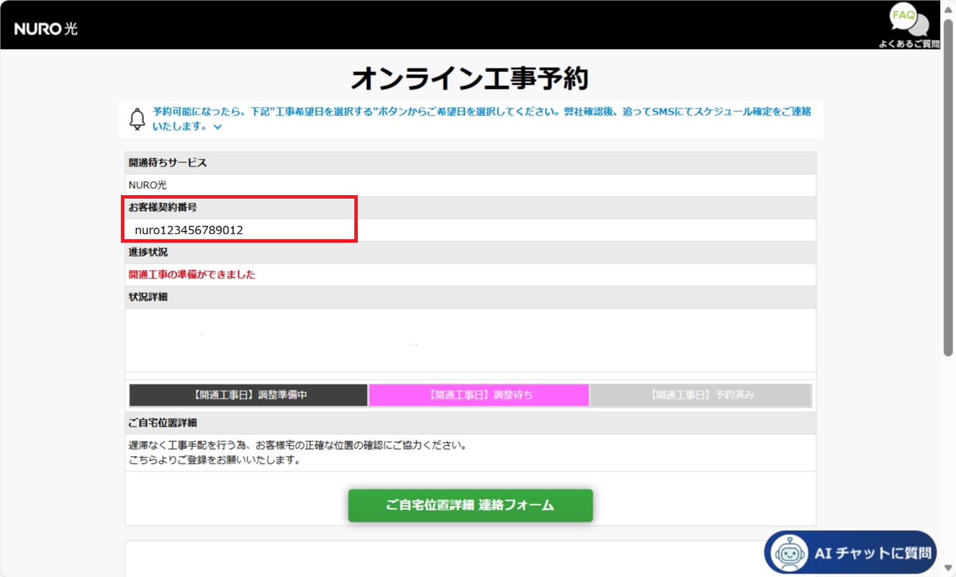 お客さま番号は、契約内容通知書やオンライン工事予約画面にてご確認いただけます。
