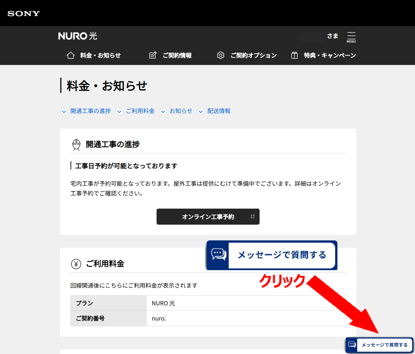 開通工事をスムースに進めるにあたり、ご確認事項を「メッセージサポート」にてご連絡をさせていただく場合がございます。