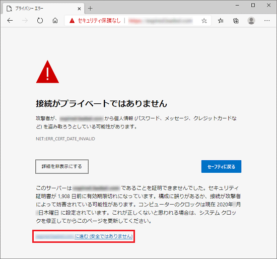 下記のメッセージが表示される場合は、「詳細設定」ボタンをクリックし、「進む(安全ではありません)」をクリックいただくと、お進みいただけます。