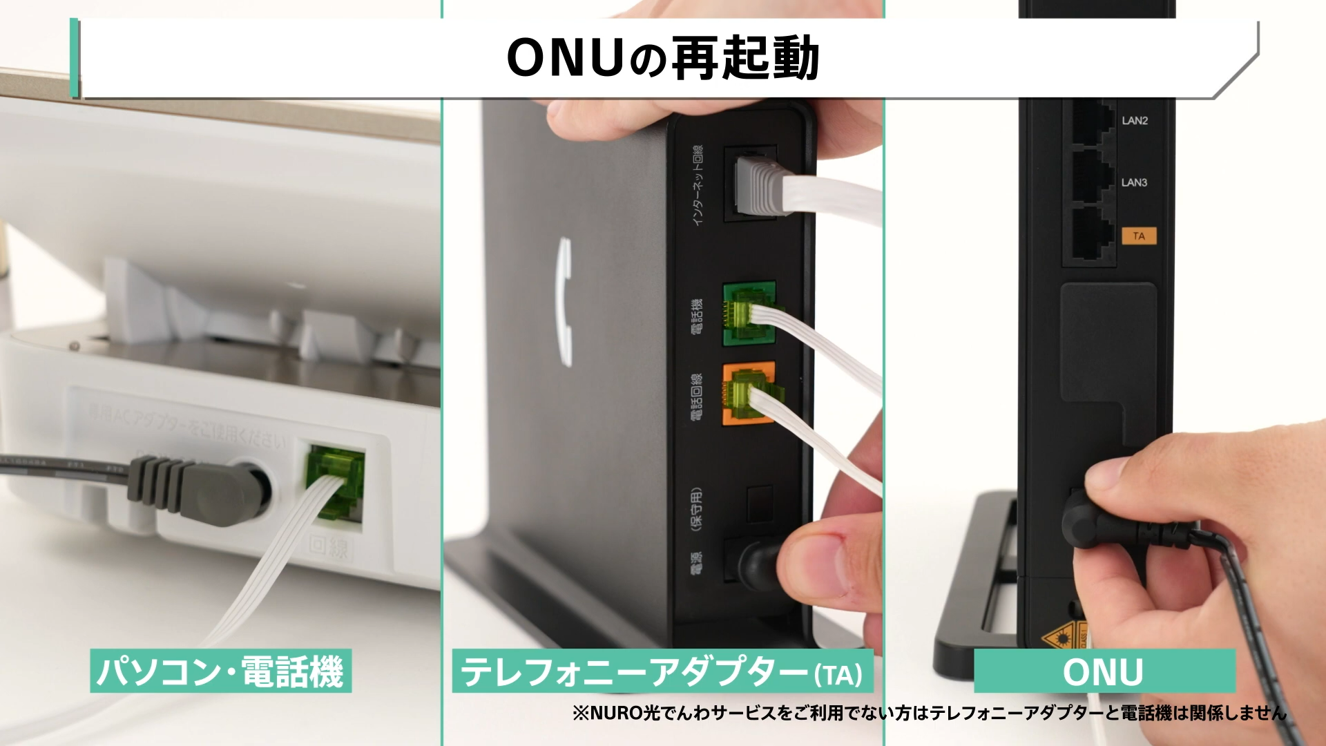 ※ONU / TA は機器本体につながっている電源ケーブルを抜くことで電源を切ることができます。