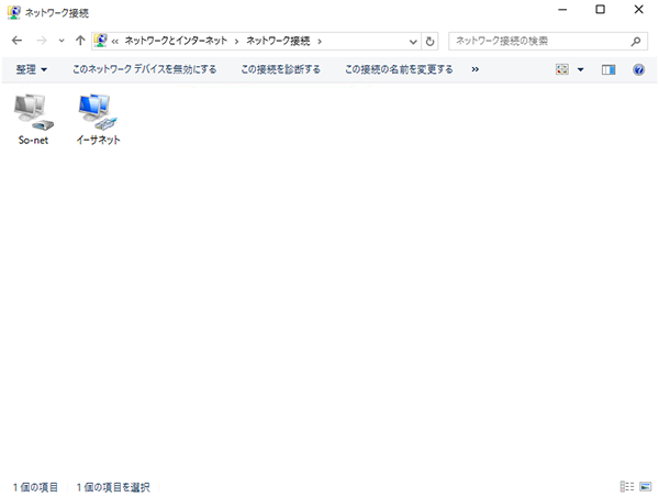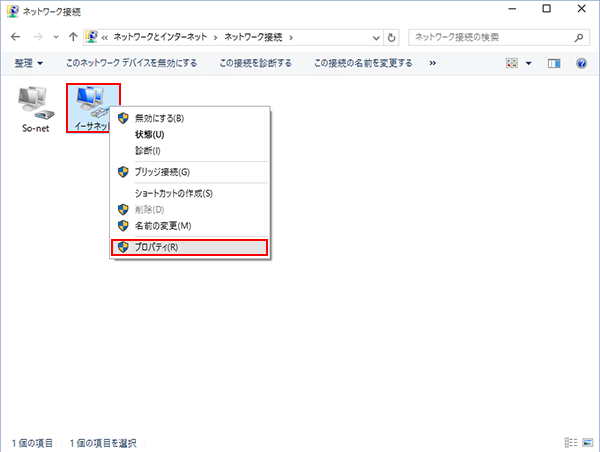 使用する「イーサネット」のアイコンを右クリックして、表示されたメニューから「プロパティ(R)」を選択します。