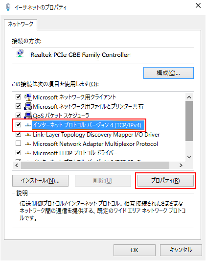 設定しましたら、「インターネット プロトコル バージョン 4 (TCP/IPv4)」を選択した状態で、「プロパティ(R)」を選択します。