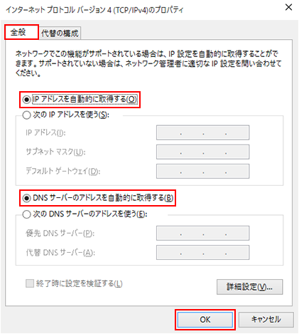 - 「IP アドレスを自動的に取得する(O)」を選択