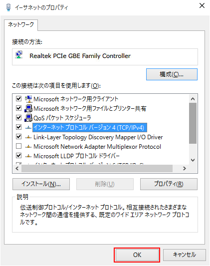 - 「インターネット プロトコル バージョン 4 (TCP/IPv4)」: チェック