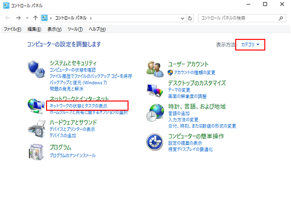 ※ 画面右上の「表示方法:」で「カテゴリ」が選択されていることを確認してください。