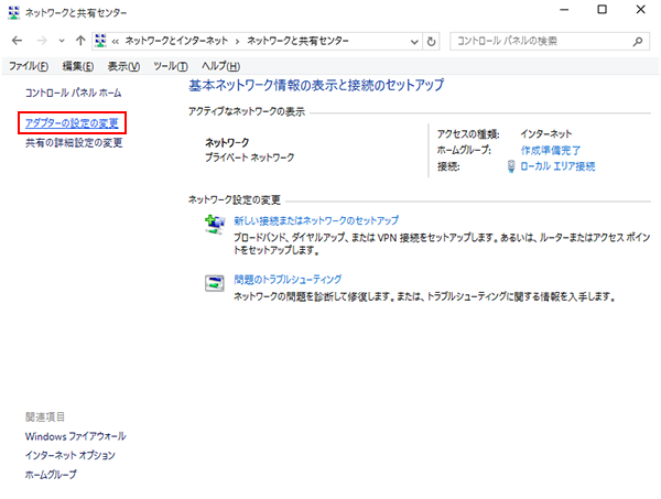 STEP3 「ネットワークと共有センター」の画面で、画面左側のタスクから「アダプターの設定の変更」を選択します