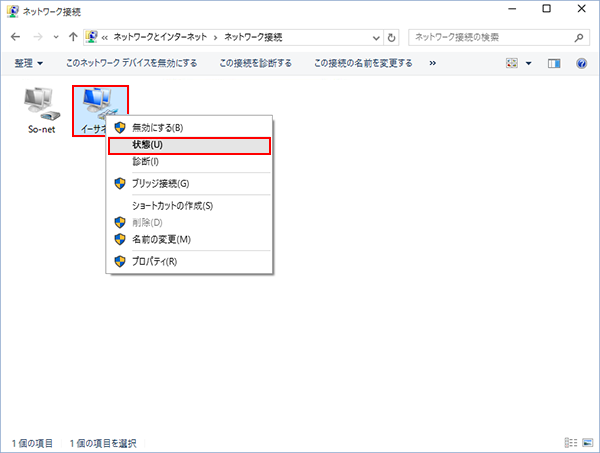 使用する「イーサネット」のアイコンを右クリックして、表示されたメニューから「状態(U)」を選択します。