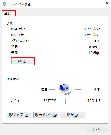 STEP5 「イーサネットの状態」画面の「全般」タブで、「詳細(E)...」を選択します