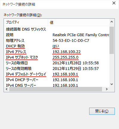 ※ 「IP アドレス」などが正しく表示されない場合は、モデムの再起動、パソコンの再起動をおこなってください。